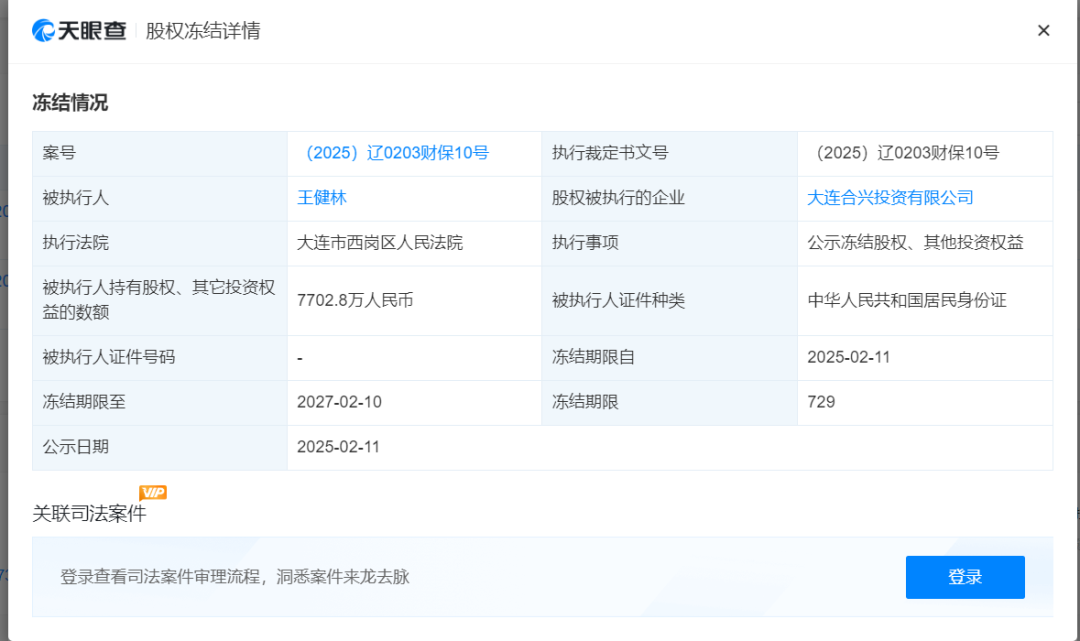 王健林所持大连合兴投资有限公司7702.8万元股权被冻结,执行法院为大连市西岗区人民法院。此外,王健林去年已有多笔大额资产出售记录,2025年开年更是连卖5座万达广场,资产处置大戏继续上演。