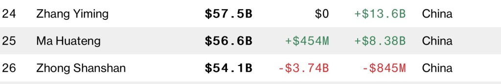 彭博亿万富豪榜同样显示,张一鸣登顶中国首富,身家为575亿美元(约合人民币4179亿元),位居全球富豪榜第24位。同一时间内,钟睒睒身家缩水37.4亿美元。