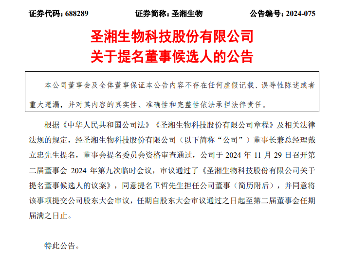 圣湘生物于11月29日晚披露,经公司董事长兼总经理戴立忠提名,董事会提名委员会资格审查通过,公司董事会审议通过了《关于提名董事候选人的议案》,同意提名卫哲担任公司董事,并将该事项提交公司股东大会审议。