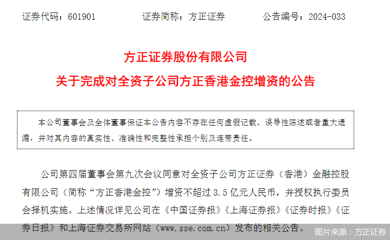 方正证券对全资子公司方正证券(香港)金融控股有限公司增资不超过3.5亿元人民币,先期增资5000万元已完成拨付,注册资金变更为11亿港元,增强资本实力支持国际业务拓展。