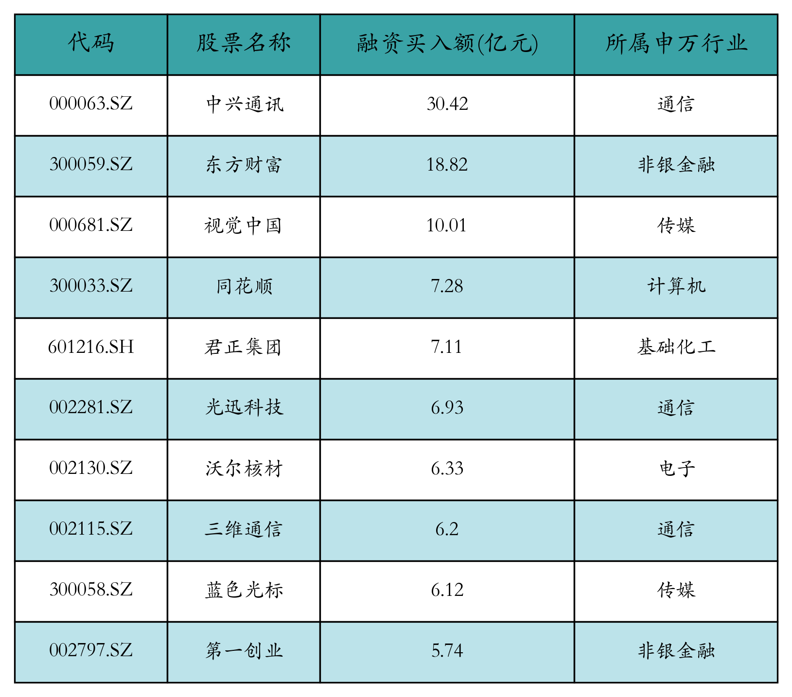 融资融券市场方面,昨日沪深两市的融资融券余额总计为18747.94亿元,其中融资余额占据主导地位,达到18644.59亿元,融券余额为103.35亿元。与前一个交易日相比,两市融资融券余额减少了61.2亿元。具体来看,沪市的两融余额为9619.69亿元,环比减少20.53亿元;深市的两融余额为9128.24亿元,环比减少40.68亿元。在个股方面,昨日共有3388只个股获得融资资金的青睐,其中中兴通讯、东方财富、视觉中国位列融资买入金额前三,分别买入30.42亿元、18.82亿元和10.01亿元。具体融资买入额前10个股的详细数据,请参见下表: