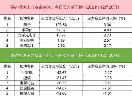 铜缆高速连接、算力等板块涨幅居前,而白酒、零售等板块则表现不佳。电子板块资金净流入最多,连续三日领跑市场。