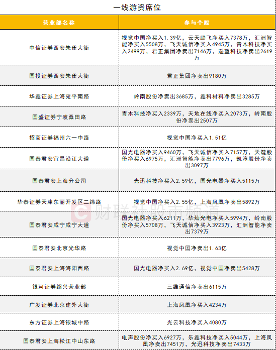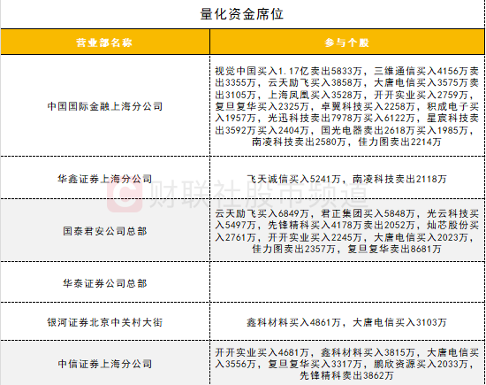 一线游资活跃度提升,视觉中国、国光电器等个股成为游资追捧的热门。量化资金活跃度持续高涨,多只个股遭量化席位做T。