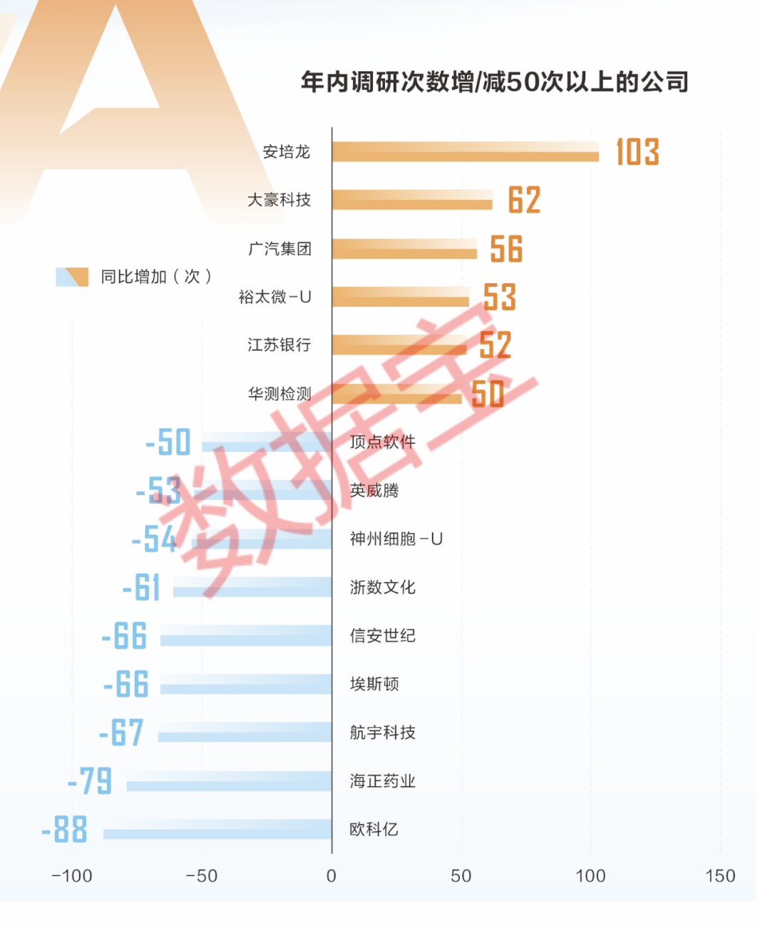 此外,从机构调研次数的变动情况来看,安培龙是今年机构调研次数增加最多的公司之一,年内已获得122次机构调研,较去年全年增加103次。相反,一些公司经营规模较小、业绩表现不理想的公司,如欧科亿、海正药业等,机构调研次数均下降50次以上。