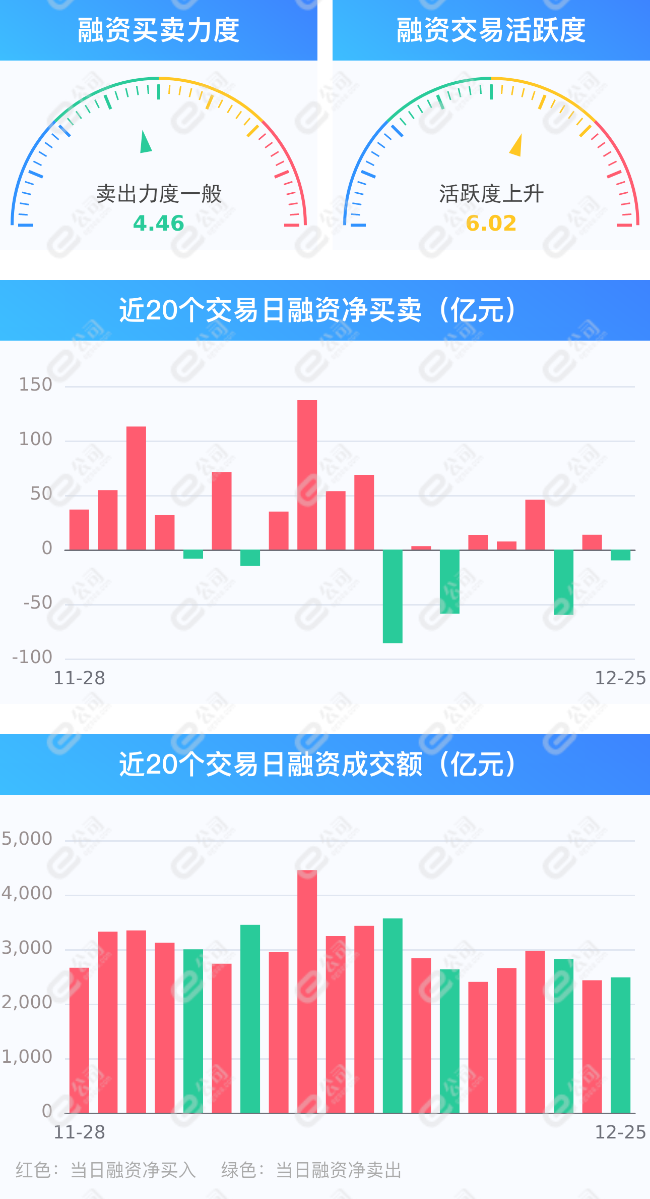 截至12月25日,上交所融资余额报9556.99亿元,环比下降11.01亿元;深交所融资余额报9097.74亿元,环比增加1.01亿元。两市合计减少10亿元,融资交易额占A股成交额19.39%,市场活跃度上升2.21%。