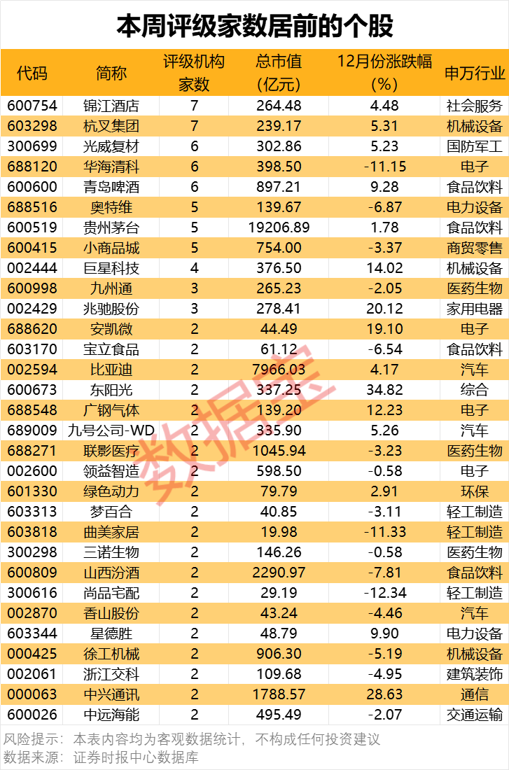 据证券时报·数据宝统计,12月23日至12月27日,58家机构共进行了266次评级,其中200只股票被券商研报赋予了“买入型”评级,涵盖买入、增持、强烈推荐、推荐等评级类型。机构关注度最高的股票为锦江酒店和杭叉集团,各有7家机构评级,光威复材、华海清科、青岛啤酒紧随其后,均获6家机构评级。奥特维、贵州茅台、小商品城也各有5家机构重点关注。