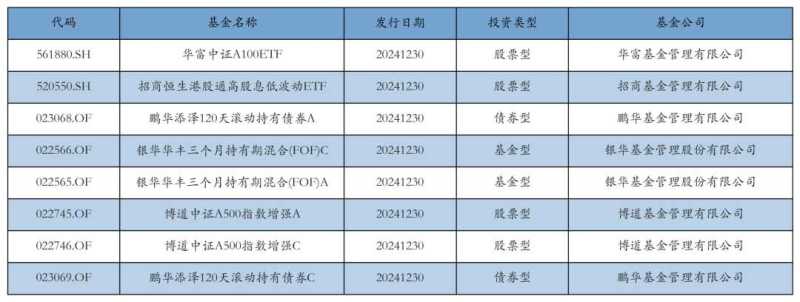 昨日,基金市场迎来8只新基金的发行,包括华富中证A100ETF、招商恒生港股通高股息低波动ETF、鹏华添泽120天滚动持有债券A、银华华丰三个月持有期混合(FOF)C、银华华丰三个月持有期混合(FOF)A、博道中证A500指数增强A、博道中证A500指数增强C以及鹏华添泽120天滚动持有债券C。详细的发行信息请参见下表: