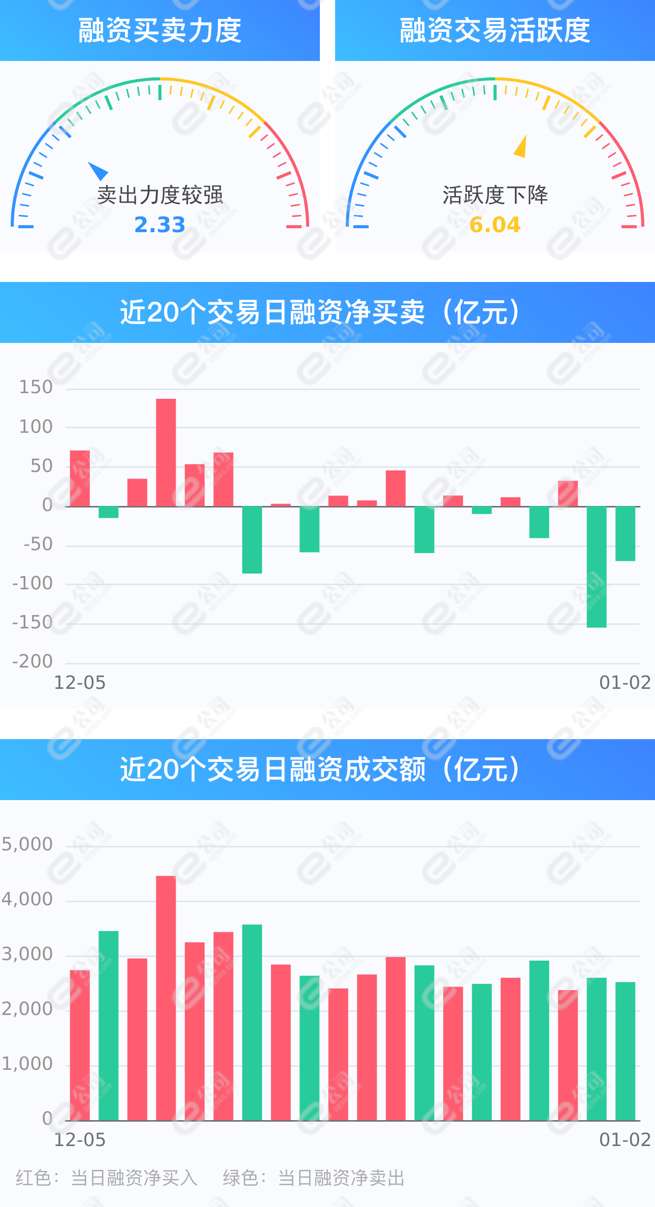 截至1月2日,上交所融资余额报9480.29亿元,深交所报8952.60亿元,两市合计减少70.07亿元,融资交易额占A股成交额18.02%,交易活跃度下降3.00%。