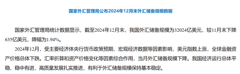 2024年12月,美元走强对全球资产价格造成冲击。受主要经济体央行货币政策预期及宏观经济数据等多重因素影响,美元指数上涨,导致全球金融资产价格普遍下跌。在此背景下,我国外汇储备规模受到汇率折算和资产价格变化等因素的综合影响,出现了一定程度的下降。