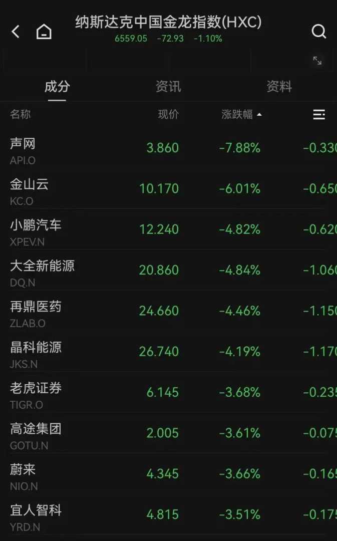 中概股方面,多数股票呈现下跌趋势,纳斯达克中国金龙指数跌幅超过1%。具体个股中,金山云跌幅超过6%,小鹏汽车跌幅超过4%,蔚来跌幅超过3%。
