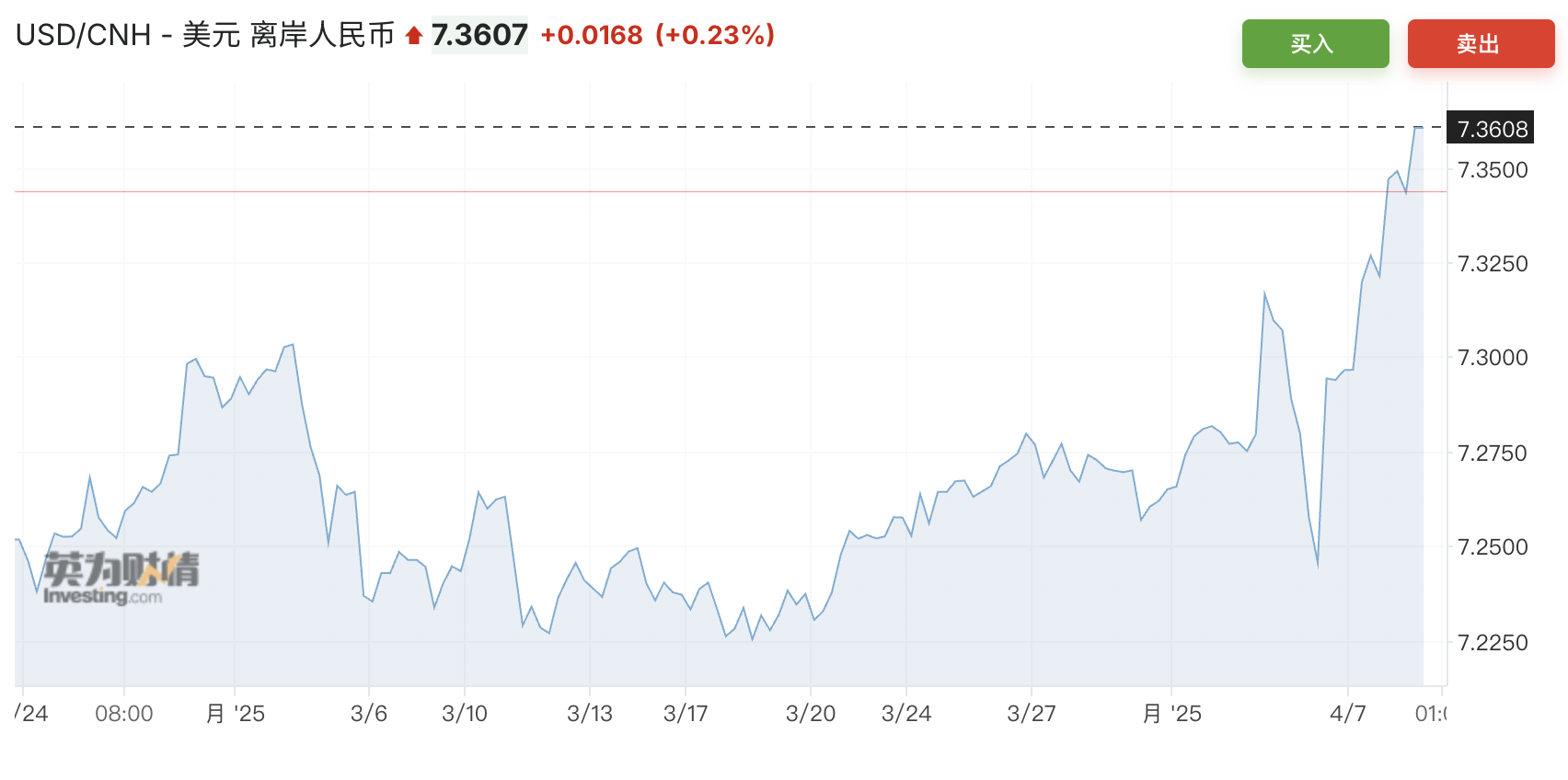 与此同时,美元指数隔夜回升至103上方。欧元和英镑隔夜大幅回落,美元/日元连续两天从145下方完成日内的触底反弹。在美元走强和关税风险的双重作用下,人民币中间价一举突破7.2,早盘美元对离岸人民币更是突破7.34。截至北京时间4月8日17:40,美元/离岸人民币已突破7.36关口报7.3601,美元/人民币报7.3385。