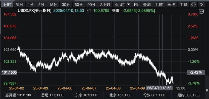 4月11日,美元指数跌破100关口,为2023年7月以来首次。此前一日,美元指数下跌1.97%。