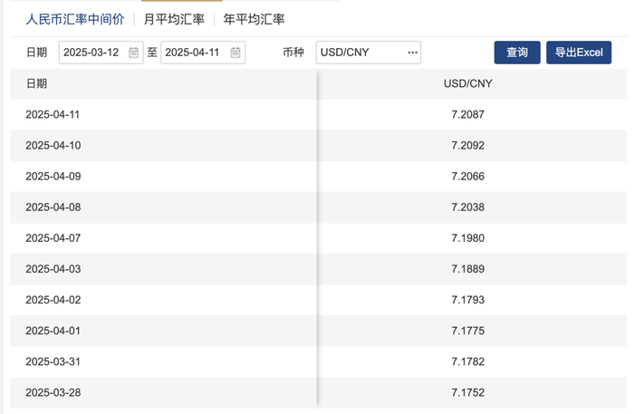 对比来看,在4月8日之前,人民币对美元汇率中间价长期保持在7.2以下。近日人民币汇率市场波动主要受美国政府关税政策反复调整的影响。