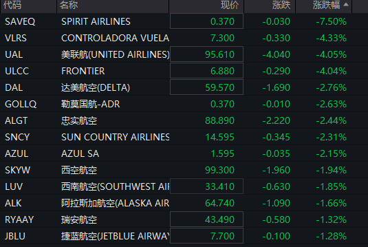在美股个股方面,大型科技股普遍下跌,其中特斯拉跌超3%,META、亚马逊跌超2%。此外,波音公司股价大幅下跌超4%,近期波音737-800客机安全事故频发,引发市场担忧。航空公司股票也普遍下跌。