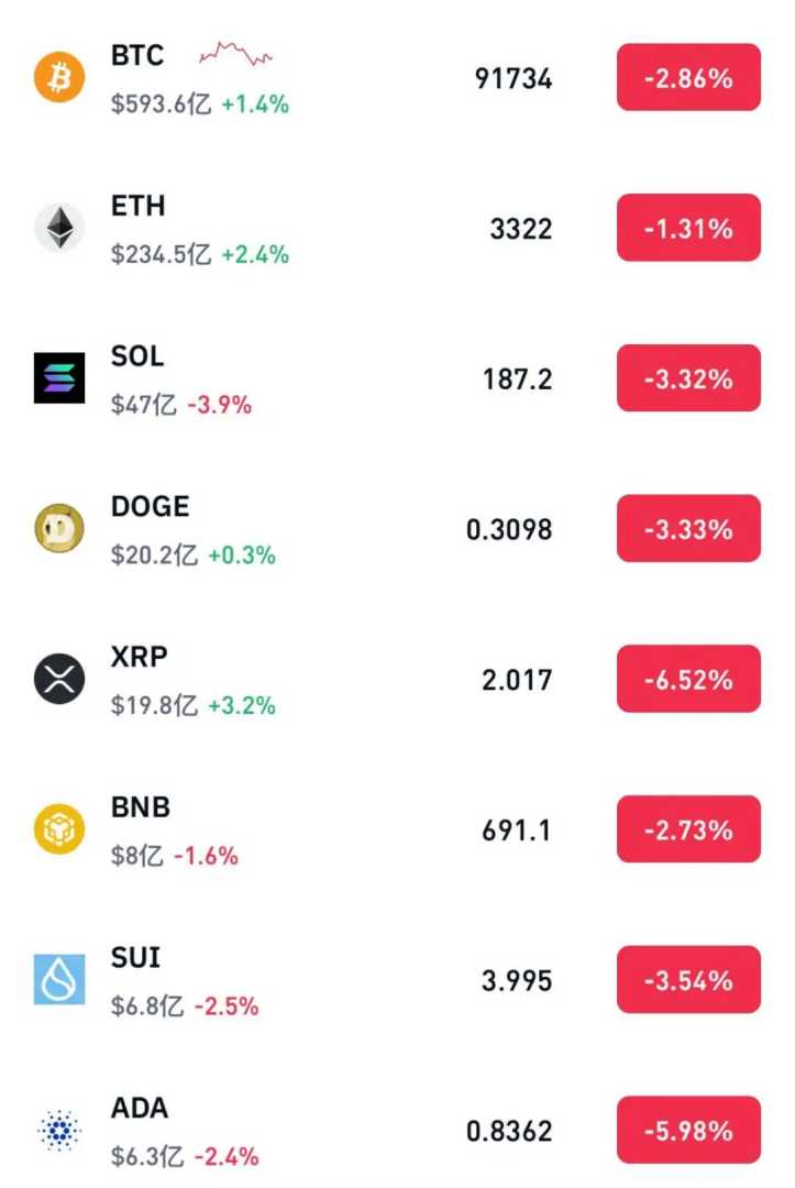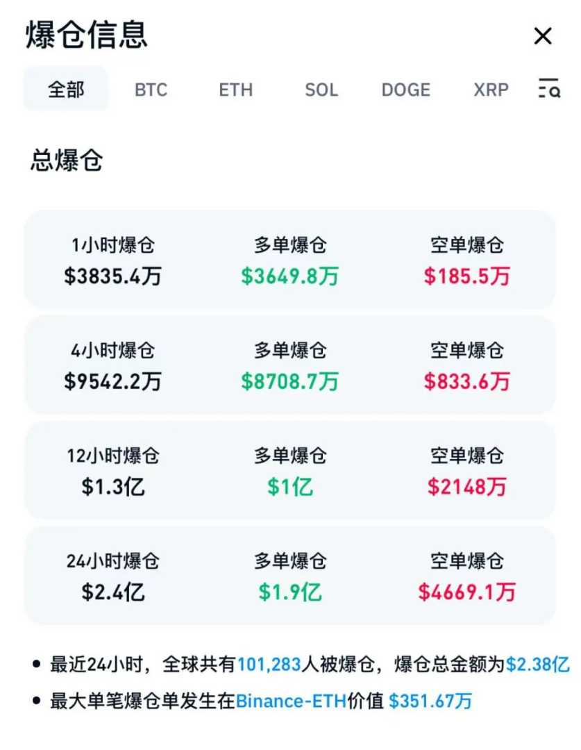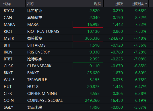 加密货币市场同样遭遇重挫,比特币跌破92000美元关口,跌幅接近3%。据CoinGlass数据显示,最近24小时内,加密货币市场超过10万人爆仓,总金额达到2.38亿美元。受此影响,美股区块链概念股普遍走低。